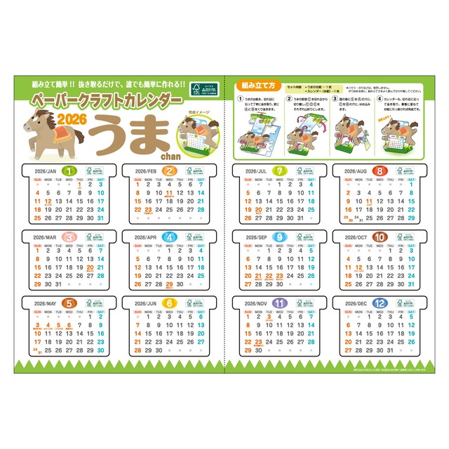 自分で組立てできる、かわいいペーパークラフトカレンダーです。切り取るだけで、誰でも簡単に組み立てることができます。全て紙仕様の環境にやさしいカレンダーです。 カレンダー種別:卓上カレンダー サイズ(縦mm×横mm):157×151 用紙:マットコート紙 枚数:台紙A4・1枚、カレンダーA3・1枚 名入れスペース:台紙 名入れ印刷寸法(縦mm×横mm):12×80mm以内 名入れ方法:台紙に箔押し 袋:OP袋入りセット ※用紙などの関係で、商品の色は実際と異なる場合があります。 ※一部デザイン・仕様などを変更する場合があります。 ※法改正により、祝日の名称、休日が変更になる場合があります。 <この商品の納期> 30日後迄に発送(名入れ原稿校了後)※名入れなしの場合14日後迄に発送。 【名入れをご希望のお客様】 ・名入れの内容は注文画面の備考欄にご記入ください。 ・その他、名入れに関するご希望(ロゴマークを入れたい等)は、すべて注文画面の備考欄にご記入ください。内容によって弊社よりメールでご連絡させていただく場合があります。 【完全データをご入稿のお客様】 注文確定後、弊社より入稿方法をメールでご連絡いたします。