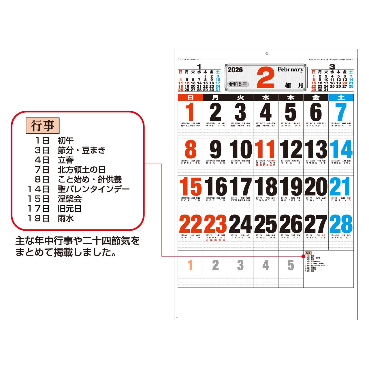 驚きのジャンボサイズ・カレンダー。内容充実、機能重視で一気にビジネスシーンを活性化させます。太くて大きな文字、点線入りのメモ欄などが魅力の、実用的な文字月表です。お客様が、毎年暮れになると心待ちにしてくれているカレンダーです。