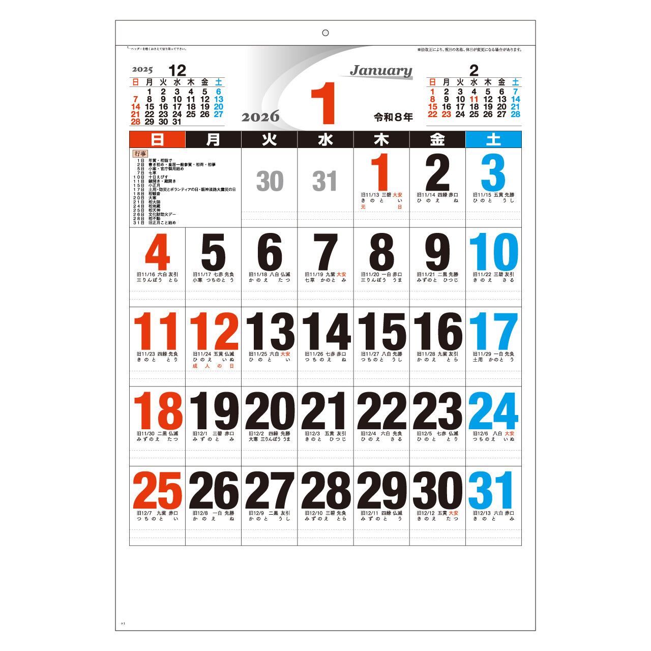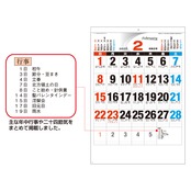 一般のカレンダーより一回り大きいサイズで、オフィスでの活用は勿論、ご家庭でも喜ばれています。太くて見やすい文字、広いメモスペースに加え、旧暦・二十四節気・雑節が入った暦の機能充実の便利な文字月表です。