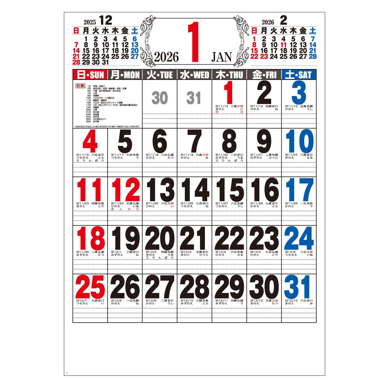 遠くから見ても良く見える大きな文字、広いメモスペース、充実した暦の機能と、使いやすさ抜群のA2サイズの文字月表です。環境にやさしいホットメルト製本です。