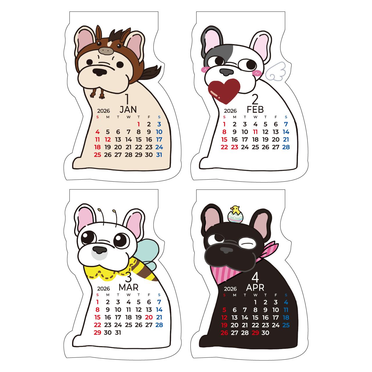 犬(フレンチブルドッグ)型のかわいいカレンダーです。毎月、犬の表情などが変わります。